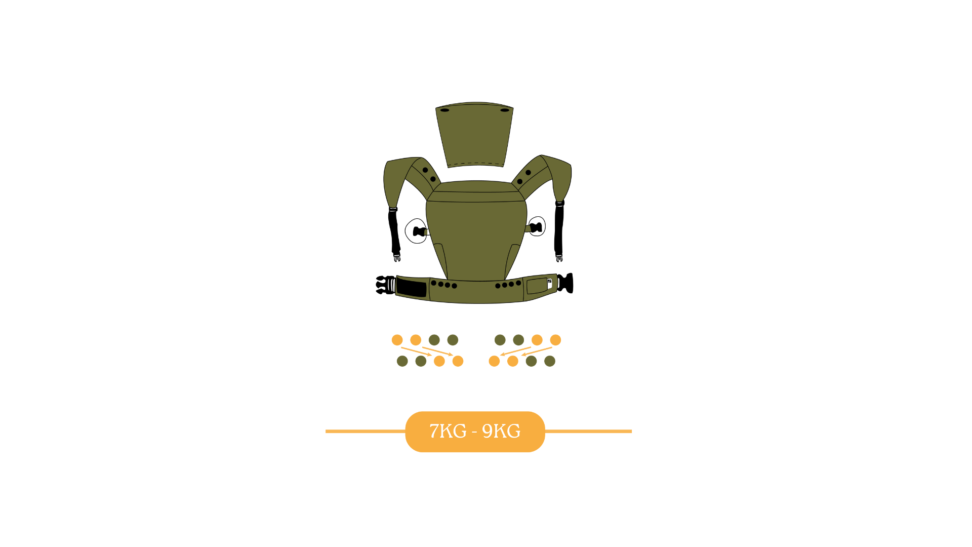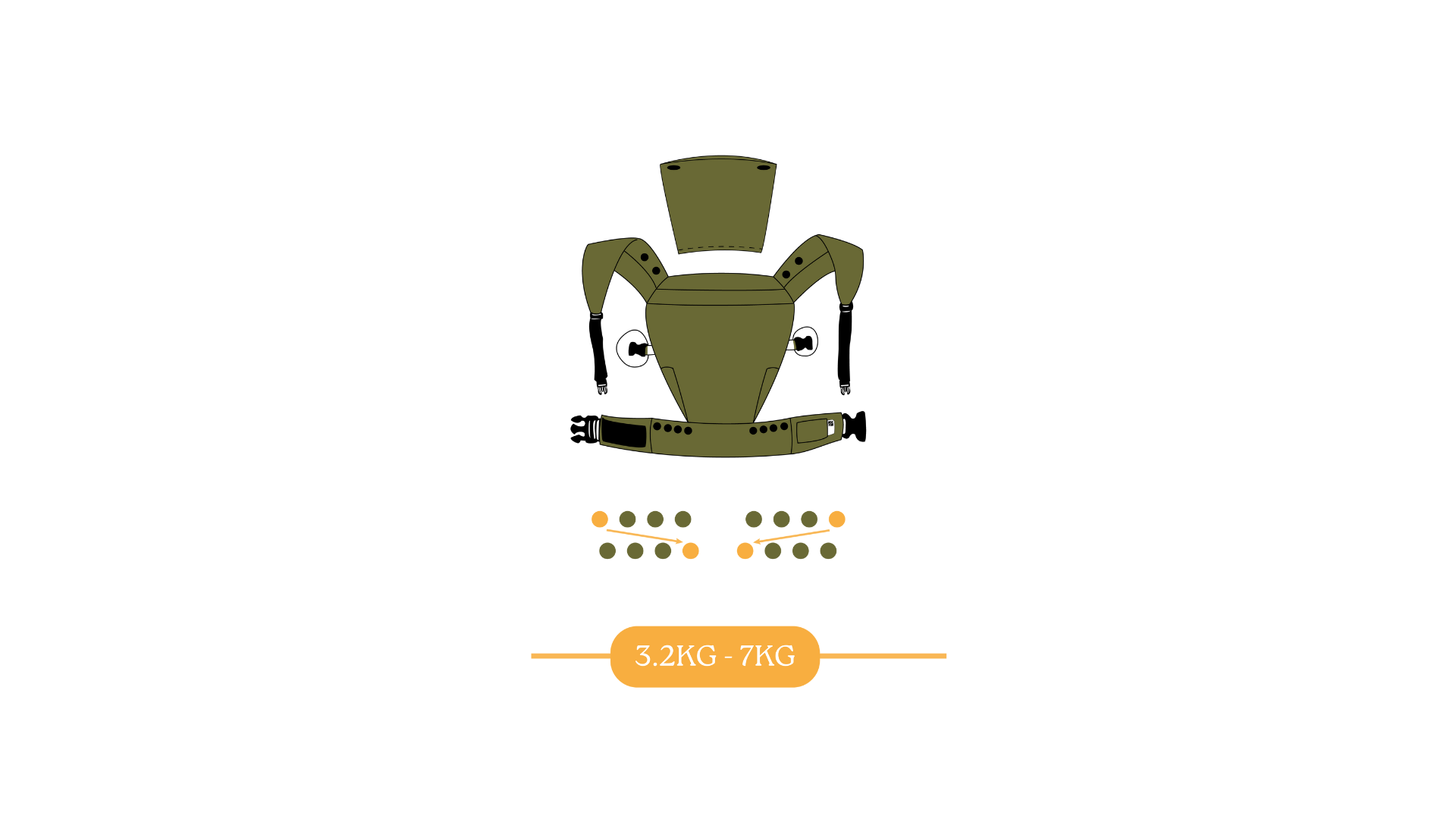 Usar 1 botón de presión para hacer el cargador lo más angosto posible para un recién nacido de 3.2kg hasta los 7kg.